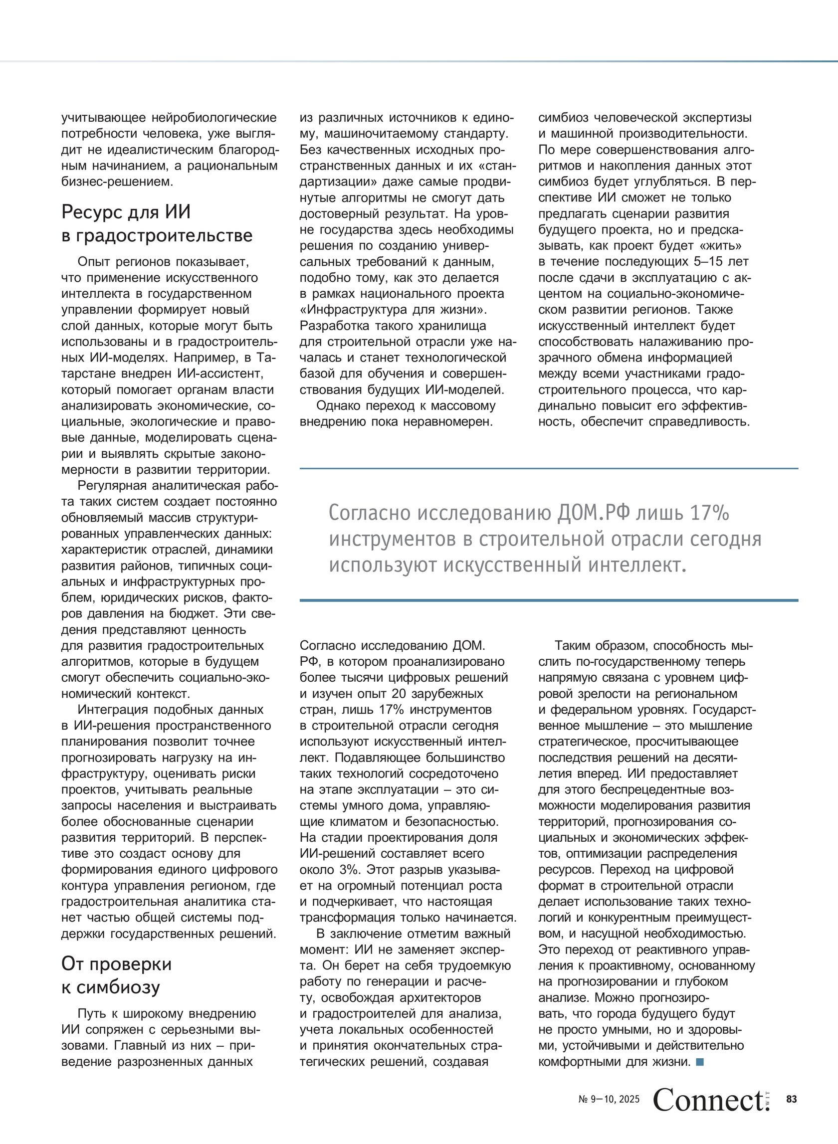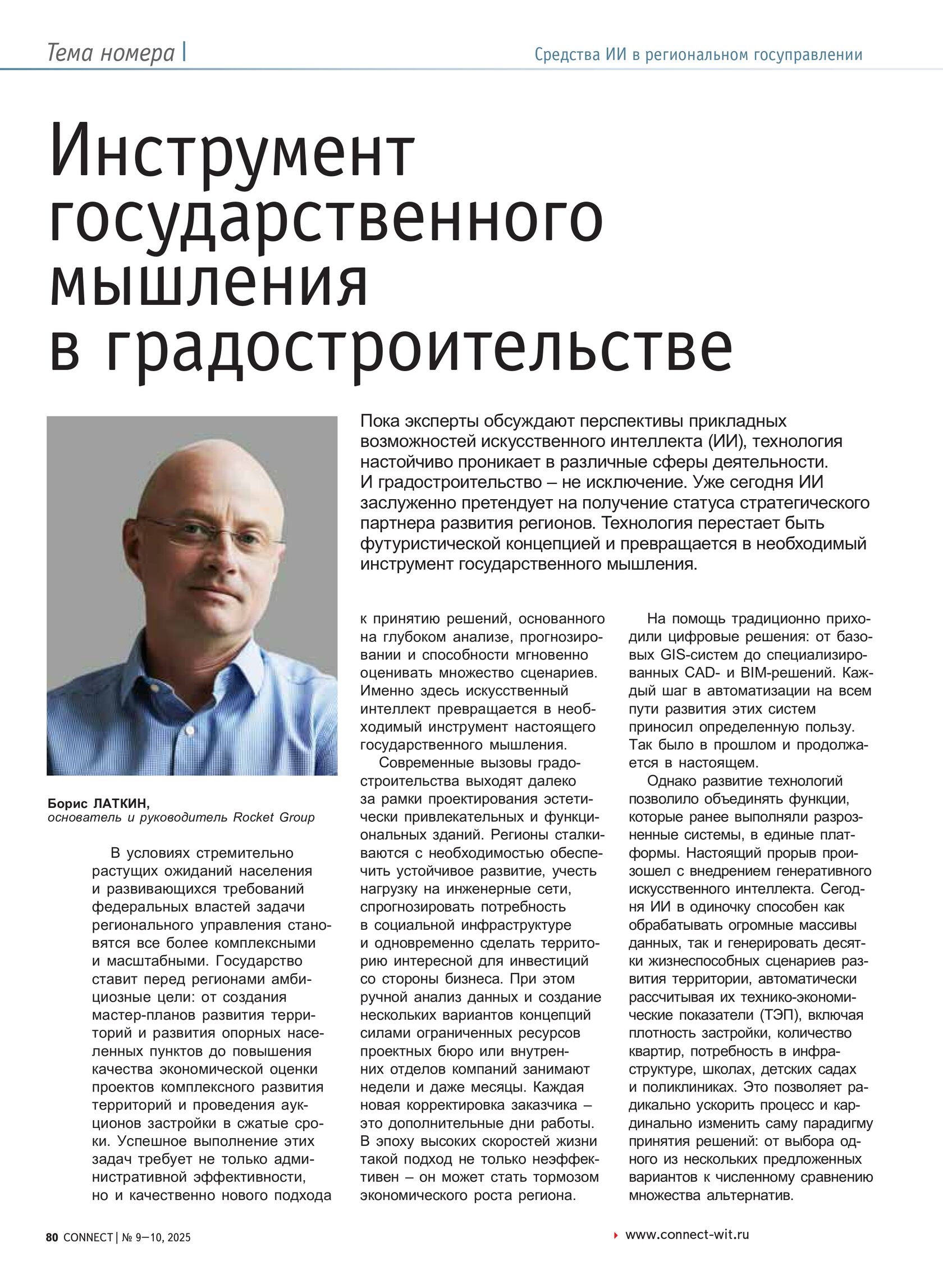 В журнале «CONNECT. Мир информационных технологий» вышла статья Бориса Латкина «Инструмент государственного мышления в градостроительстве». В статье — обзор AI-инструментов и аналитических платформ, которые используются в региональном управлении.